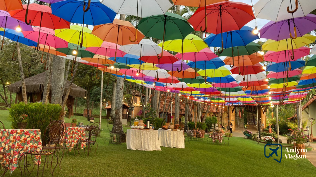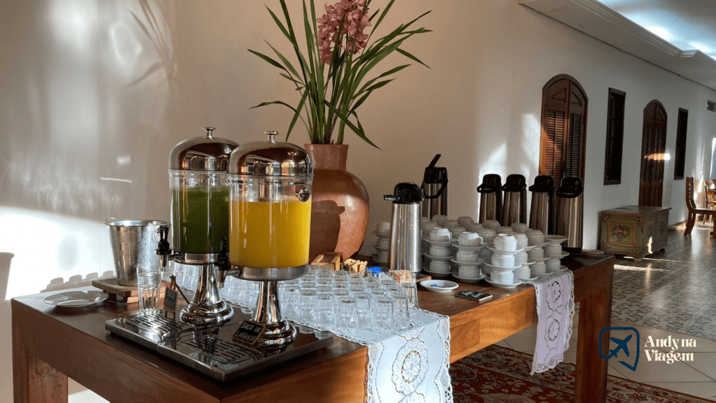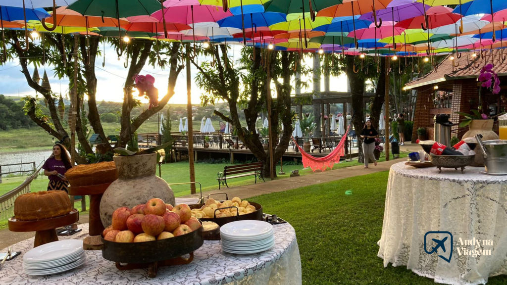 Outro detalhe que me chamou atenção foi o café da tarde no jardim, montado sob os guarda-chuvas coloridos, com bolo caseiro, frutas e pão de queijo quentinho, acompanhado de suco natural, refrigerante e café expresso. Uma experiência simples, mas acolhedora.