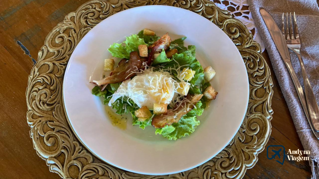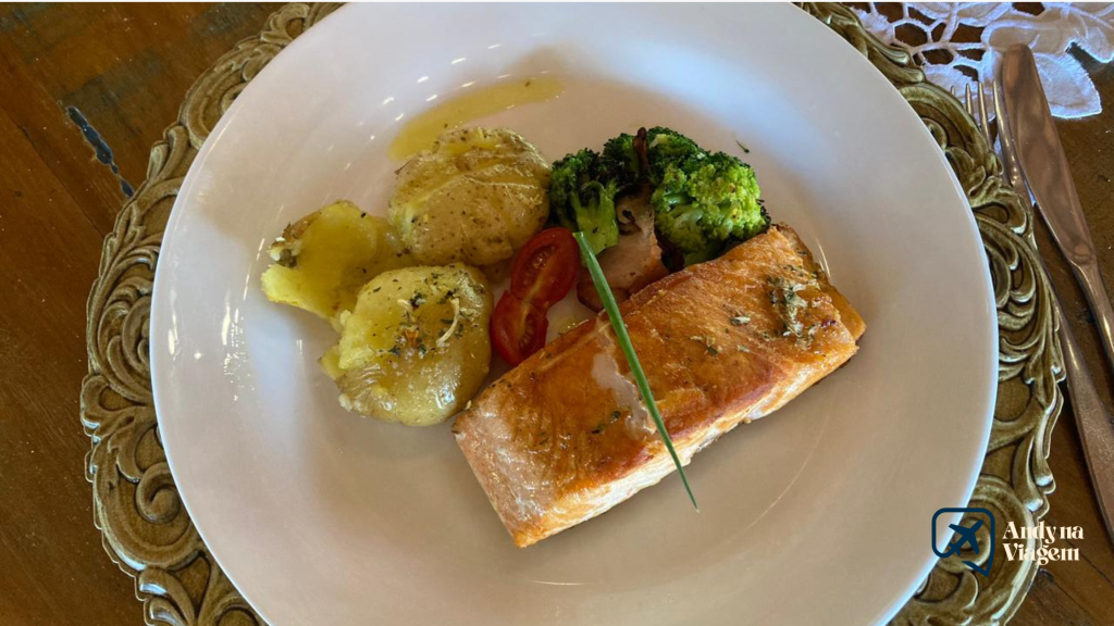 Minha experiência gastronômica foi muito positiva. No primeiro dia, como haviam poucos hóspedes, o almoço foi servido à la carte. Pedi um prato de salmão, acompanhado de algumas guarnições saborosas e suco natural de abacaxi com hortelã. O mais surpreendente, no entanto, foi a forma de servir: os garçons trouxeram os pratos cobertos com cloches (aquelas charmosas tampas metálicas usadas em jantares de gala) e os abriram ao mesmo tempo, de forma ensaiada. Foi impossível não me sentir parte de um filme de época, daquelas cenas em que a realeza é servida com pompa e elegância.